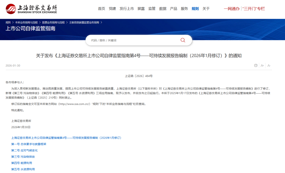 关于发布《上海证券交易所上市公司自律监管指南第4号——可持续发展报告编制(2026年1月修订)》的通知