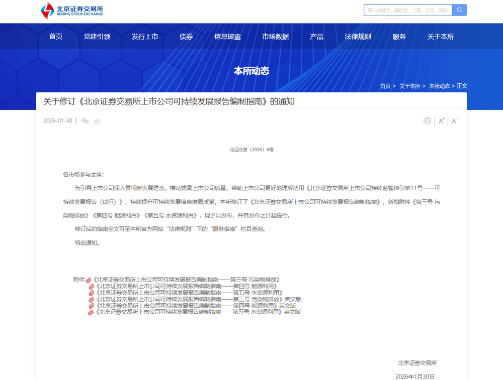 为引导上市公司深入贯彻新发展理念,推动提高上市公司质量,帮助上市公司更好地理解适用《北京证券交易所上市公司持续监管指引第11号——可持续发展报告(试行)》,持续提升可持续发展信息披露质量,本所修订了《北京证券交易所上市公司可持续发展报告编制指南》,新增附件《第三号 污染物排放》《第四号 能源利用》《第五号 水资源利用》,现予以发布,并自发布之日起施行。