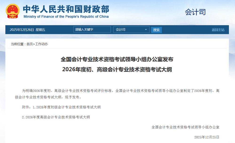确定了!2026年度初、高级会计专业技术资格考试大纲发布 发布时间:2025年12月29日 浏览次数: 次 【字体:小 大】 为明确2026年度初、高级会计专业技术资格考试评价标准,全国会计专业技术资格考试领导小组办公室制定了2026年度初、高级会计专业技术资格考试大纲,现予发布。一起来看看吧! (点击查看原文)2026年度初级会计专业技术资格考试大纲 长按二维码查看初级会计考试大纲2026年度高级会计专业技术资格考试大纲 长按二维码查看高级会计考试大纲转自:财政部、广东财政 点赞 分享到: 【打印正文】